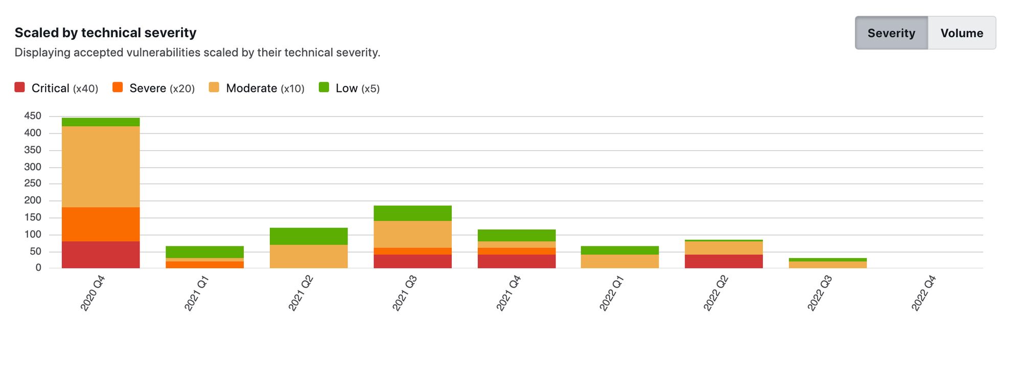 Below is the timeline of vulnerabilities reported per quarter based upon their severity: